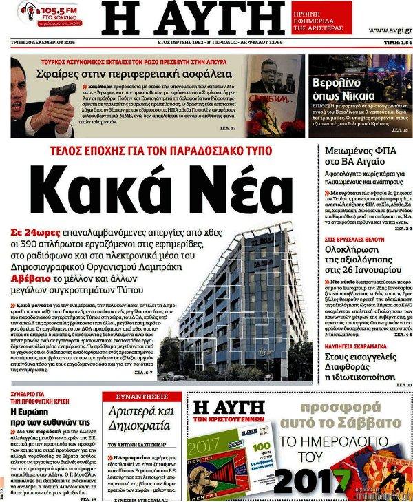 Οι εξελίξεις στον ΔΟΛ βρέθηκαν στο πρωτοσέλιδο, και μάλιστα ως πρώτο θέμα, της «Αυγής, που είχε ως κεντρικό τίτλο «Κακά Νέα» και «Τέλος εποχής για τον παραδοσιακό Τύπο».