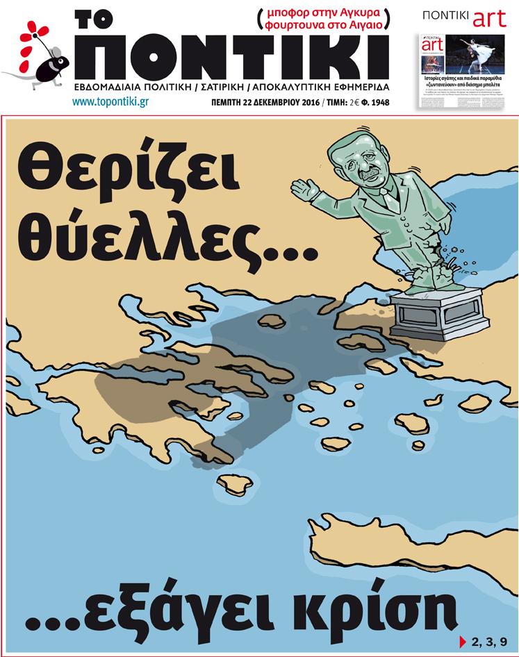 Με πρωτοσέλιδο για τον Ερντογάν και τίτλο «Θερίζει θύελλες… εξάγει κρίση». Το «Ποντίκι» κυκλοφορεί το πρωί της Πέμπτης με αναλυτικό – αποκαλυπτικό ρεπορτάζ για τις εξελίξεις στην Τουρκία, μετά την δολοφονία του Ρώσου πρέσβη στην Άγκυρα.