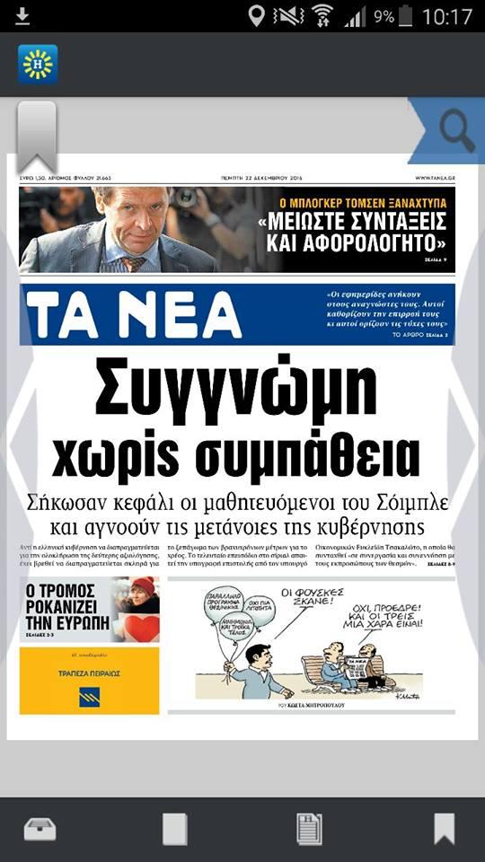 Μετά το ΒΗΜΑ που “σχολίασε” τις εξελίξεις με μια αιχμηρότατη ανάρτηση στο vima.gr, με ένα κεντρικό άρθρο-γεμάτο αιχμές- με τίτλο «Πάνω Νερά» επέστρεψαν σήμερα Τα ΝΕΑ καθώς έληξε η απεργία των εργαζομένων μετά την καταβολή του δώρου Χριστουγέννων την Τετάρτη.