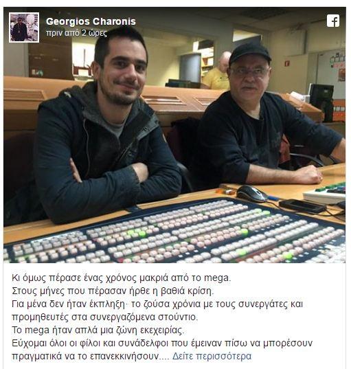 Ο Γιώργος Χαρώνης, πρώην επικεφαλής των σκηνοθετών του ενημερωτικού τομέα και ένας από τους πρωτεργάτες του καναλιού, καθώς εργαζόταν στο Mega από την πρώτη μέρα λειτουργίας του, συγκινεί με ανάρτησή του στο facebook.