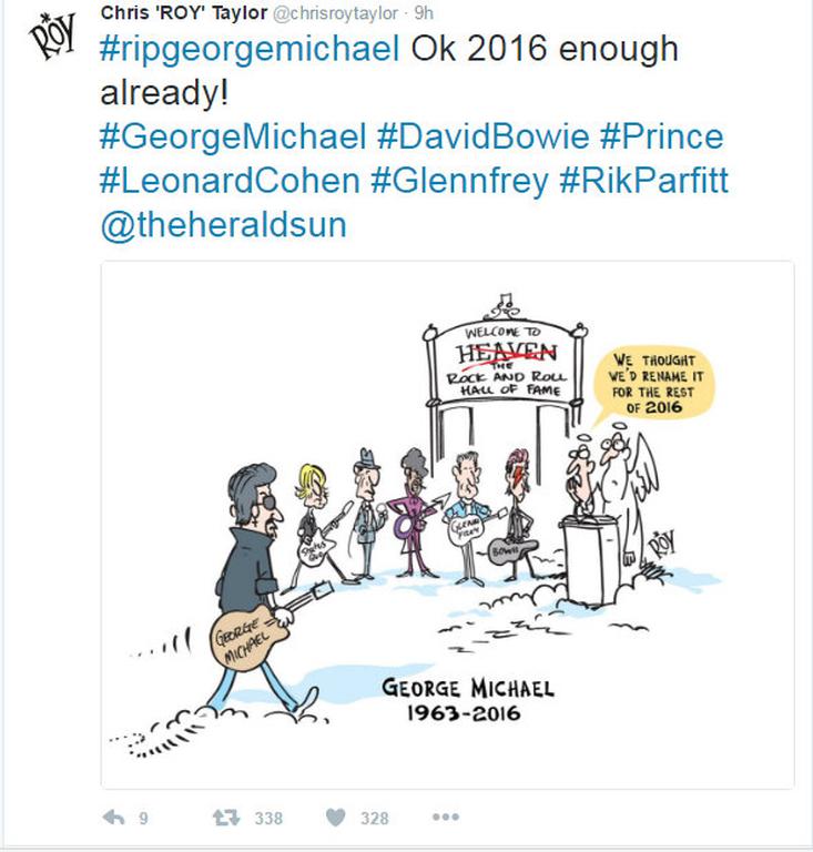 Στο σκίτσο, που «ανέβασε» στο twitter, ο George Michael πηγαίνει προς τις πύλες του Παραδείσου οπού τον περιμένουν κι άλλοι μεγάλοι καλλιτέχνες με την επιγραφή να αναφέρει: «Καλωσορίσατε στο Πάνθεον της Ροκ εν Ρολ» με τους αγγέλους να λένε: «Σκεφτήκαμε να το μετονομάσουμε για το υπόλοιπο του 2016».