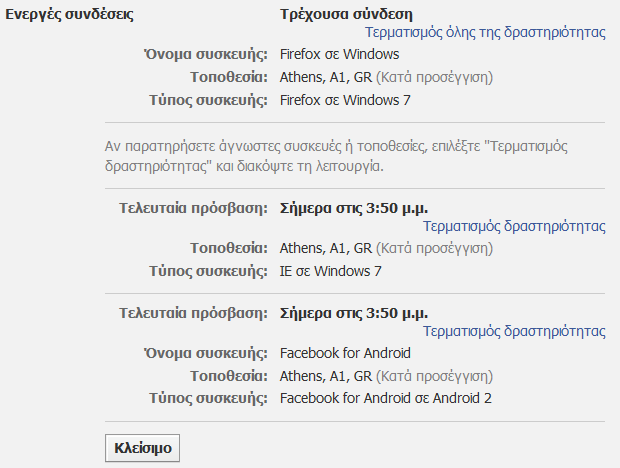 Στη νέα σελίδα θα βρεις όλες τις συνδέσεις τις οποίες έχεις πραγματοποιήσει με το Facebook προφίλ σου και δεν αποσυνδέθηκες. Εκτός από την τρέχουσα σύνδεση, η οποία ξεχωρίζει ως πρώτη και δε χρειάζεται να την πειράξεις, όλες οι υπόλοιπες συνδέσεις διαθέτουν πληροφορίες (ώρα, browser, τοποθεσία) για να σε βοηθήσουν να αποφασίσεις ποιες θες να τερματίσεις.