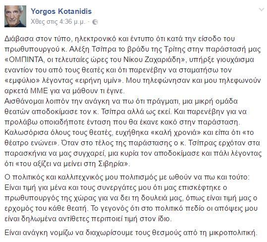 Με ανάρτησή του στο Facebook, ο ηθοποιός Γιώργος Κοτανίδης αναφέρθηκε σε όσα συνέβησαν, το βράδυ που ο πρωθυπουργός Αλέξης Τσίπρας πήγε στο θέατρο για να δει την παράσταση του και κάποιοι θεατές τον γιούχαραν.