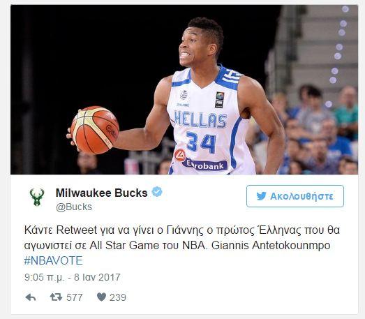 «Κάντε Retweet για να γίνει ο Γιάννης ο πρώτος Έλληνας που θα αγωνιστεί σε All Star Game του ΝΒΑ. Giannis Antetokounmpo #NBAVOTE» έγραψαν χαρακτηριστικά.