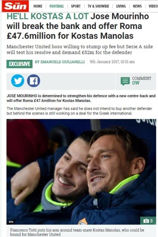 Ούτε λίγο ούτε πολύ η πρόταση της Μάντσεστερ Γιουνάιτεντ θα αγγίξει τα 55.000.000 ευρω, προκειμένου να αποκτήσει τον Έλληνα αμυντικό της Ρόμα. Ο Ζοσέ Μουρίνιο θέλει στην ομάδα του έναν αμυντικό με τα χαρακτηριστικά του Κώστα Μανωλά. Ψηλό, γρήγορο, δυνατό που να μην φοβάται να βάλει το κορμί του στις φάσεις.