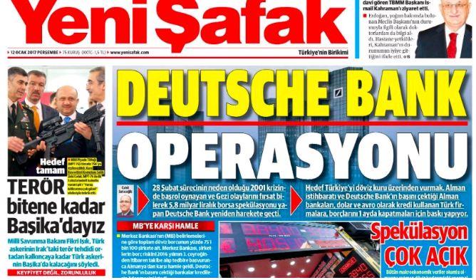 Αυτή τη φορά η φιλοκυβερνητική και φιλοερντογανική εφημερίδα Yeni Safak στο πρωτοσέλιδό της κατηγορεί ευθέως την Γερμανία και την Deutschebank ως «κερδοσκόπους» εις βάρος της Τουρκίας και της τουρκικής οικονομίας λέγοντας πως ο στόχος τους είναι να μειώσουν το κόστος των συναλλαγών που έχουν με την Τουρκία.
