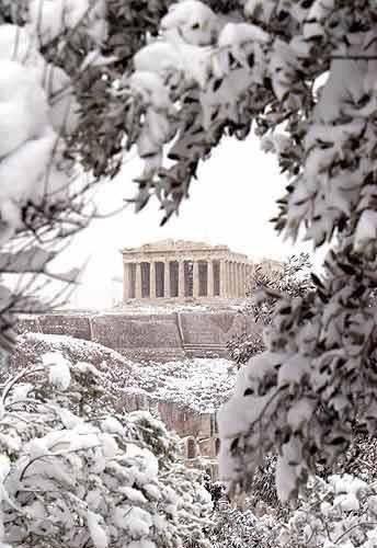 Ο βρετανικός Guardian γράφει: «Ο ναός του Πάνθεου αποτελεί την τέλεια χειμωνιάτικη εικόνα ύστερα από σπάνια χιονόπτωση στην Αθήνα».