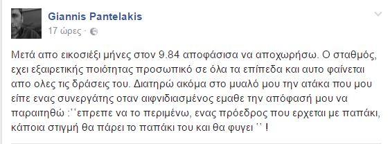 «Μετά απο εικοσιέξι μήνες στον 9.84 αποφάσισα να αποχωρήσω. Ο σταθμός, εχει εξαιρετικής ποιότητας προσωπικό σε όλα τα επίπεδα και αυτο φαίνεται απο ολες τις δράσεις του. Διατηρώ ακόμα στο μυαλό μου την ατάκα που μου είπε ενας συνεργάτης οταν αιφνιδιασμένος εμαθε την απόφασή μου να παραιτηθώ: “επρεπε να το περιμένω, ενας πρόεδρος που ερχεται με παπάκι, κάποια στιγμή θα πάρει το παπάκι του και θα φύγει”».
