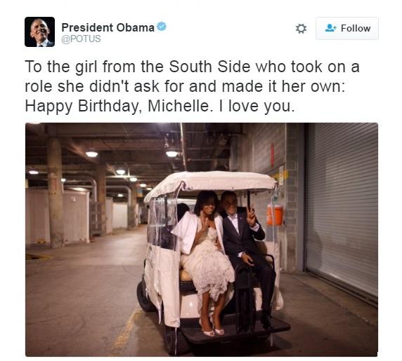 Στο εξαιρετικά τρυφερό του μήνυμα, ο Ομπάμα έγραψε: «Στο κορίτσι από το South Side που ανέλαβε ένα ρόλο τον οποίο δεν ζήτησε και τον έκανε δικό της: Χαρούμενα Γενέθλια Μισέλ. Σε αγαπώ», ανεβάζοντας και μια άκρως ρομαντική φωτογραφία τους.