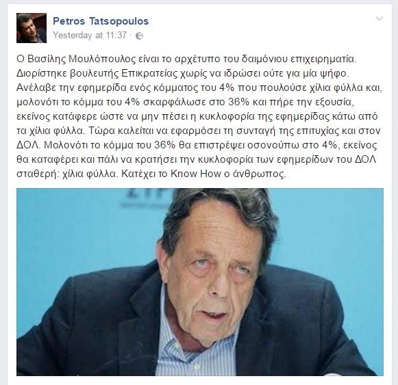 Απαντώντας στον κ. Μουλόπουλο, ο κ. Τατσόπουλος είχε γράψει στο Facebook: «Ο Μουλόπουλος ψελλίζει μισή επανόρθωση στη σημερινή “Αυγή”. Κρίμα, Βασίλη. Όπως λένε και στα χωριά μας: Too little, too late».