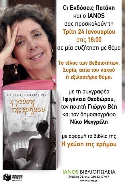 Οι Εκδόσεις Πατάκη και ο ΙΑΝΟΣ σας προσκαλούν την Τρίτη 24 Ιανουαρίου, στις 18:00, σε μια συζήτηση με θέμα: «Το τέλος των βεβαιοτήτων. Συρία, αιτία του κακού ή εξιλαστήριο θύμα;», στα βιβλιοπωλεία IANOS, Σταδίου 24.