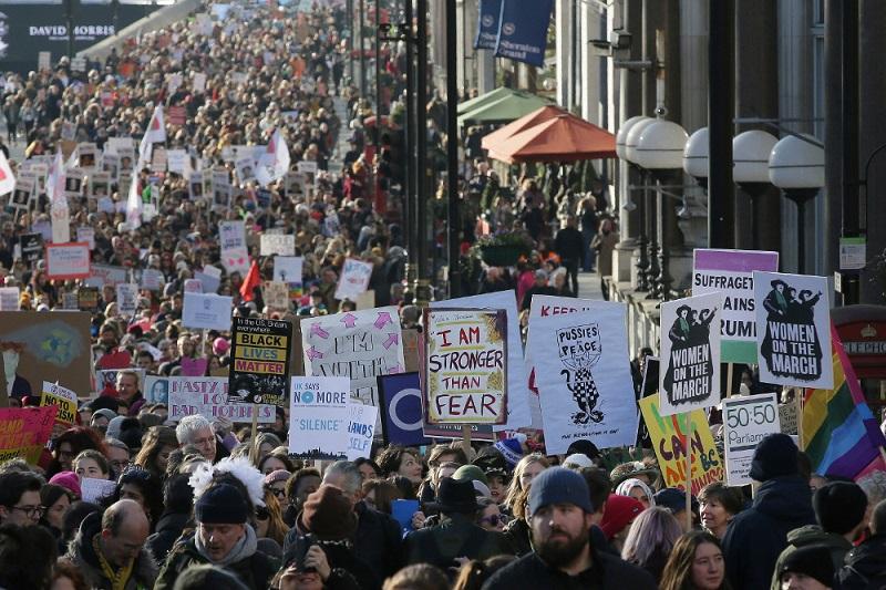 Κρατώντας πλακάτ με συνθήματα όπως “Ειδική σχέση, απλώς πείτε όχι” ή “Παλιογυναίκες, ενωθείτε” (σ.σ. από τον χαρακτηρισμό “nasty woman” που είχε χρησιμοποιήσει ο Τραμπ για τη Χίλαρι Κλίντον), οι διαδηλώτριες στο Λονδίνο συγκεντρώθηκαν εξω από την αμερικανική πρεσβεία στην Γκρόσβενορ Σκουέαρ και έκαναν πορεία μέχρι την Τραφάλγκαρ.