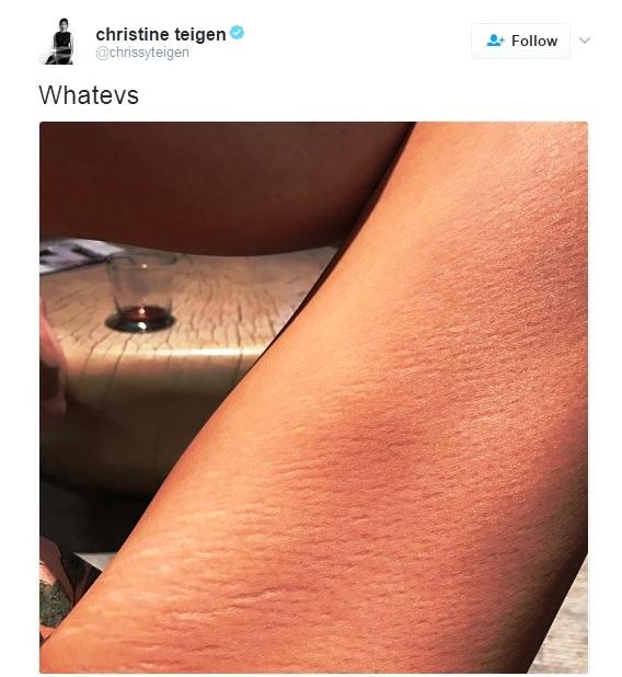 Η Teigen, λοιπόν, φωτογράφησε η ίδια τις ραγάδες που έχει στο εσωτερικό του μηρού της και ανέβασε τη φωτογραφία στο Twitter με το απίθανο σχόλιο: «Δε βαριέσαι».