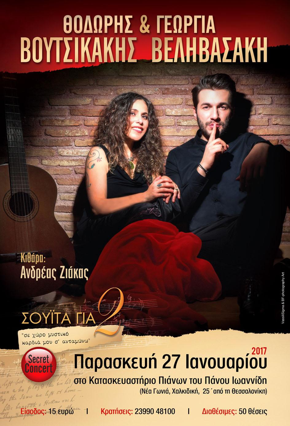 Την ίδια ώρα ο αναγνωρισμένος κιθαριστής Ανδρέας Ζιάκας δίνει ένα πραγματικό ρεσιτάλ κιθάρας μέσα από δεξιοτεχνικούς αυτοσχεδιασμούς, συνοδεύοντας υπογραμμίζοντας όμως την ερμηνευτική τους μαεστρία, των δύο φωνών. Η πρώτη παρουσίαση της «Σουίτας για 2» θα γίνει την Παρασκευή 27 Ιανουαρίου 2017(ώρα 20:00) στο Κατασκευαστήριο Πιάνων του Πάνου Ιωαννίδη (Νέα Γωνιά, Χαλκιδική – 25 λεπτά από τη Θεσσαλονίκη)