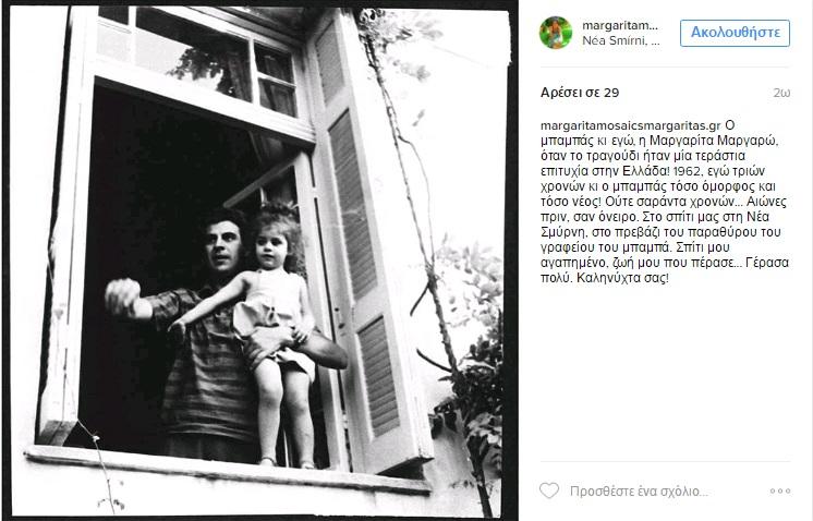 «Ο μπαμπάς κι εγώ, η Μαργαρίτα Μαργαρώ, όταν το τραγούδι ήταν μία τεράστια επιτυχία στην Ελλάδα! 1962, εγώ τριών χρονών κι ο μπαμπάς τόσο όμορφος και τόσο νέος! Ούτε σαράντα χρονών… Αιώνες πριν, σαν όνειρο. Στο σπίτι μας στη Νέα Σμύρνη, στο πρεβάζι του παραθύρου του γραφείου του μπαμπά. Σπίτι μου αγαπημένο, ζωή μου που πέρασε… Γέρασα πολύ. Καληνύχτα σας!», γράφει στην ανάρτησή της.