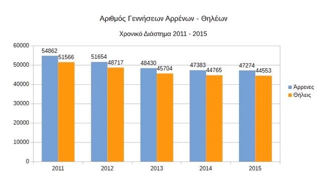 Οι γεννήσεις στην Ελλάδα κατά το 2015 ανήλθαν σε 91.847 (47.274 αγόρια και 44.553 κορίτσια), παρουσιάζοντας μείωση κατά 0,3% σε σχέση με το 2014 που είχαν ανέλθει σε 92.148 (47.383 αγόρια και 44.765 κορίτσια).