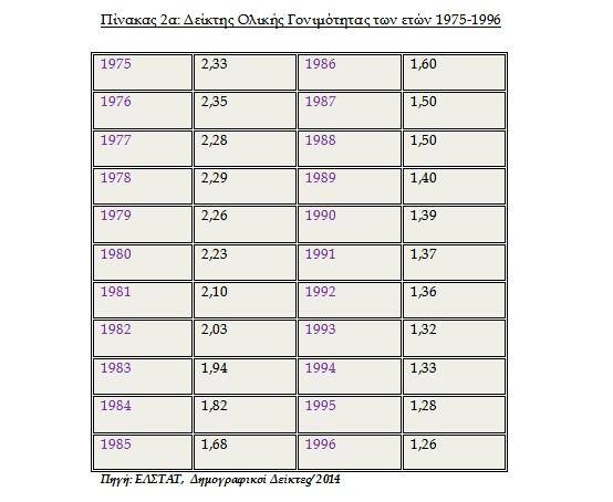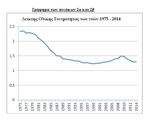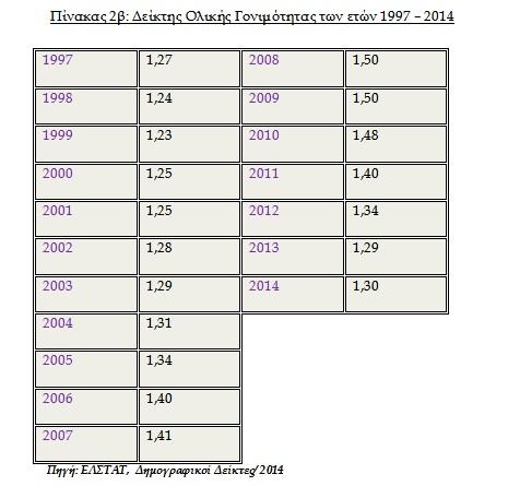 (Ο δείκτης εκφράζει το επίπεδο γονιμότητας, δηλαδή το μέσο αριθμό ζωντανών παιδιών που θα γεννήσει μία γυναίκα κατά τη διάρκεια της ζωής της και χρησιμοποιείται, προκειμένου να προσδιοριστεί το επίπεδο αντικατάστασης των γενεών που στις ανεπτυγμένες χώρες θεωρείται ότι είναι 2,1).