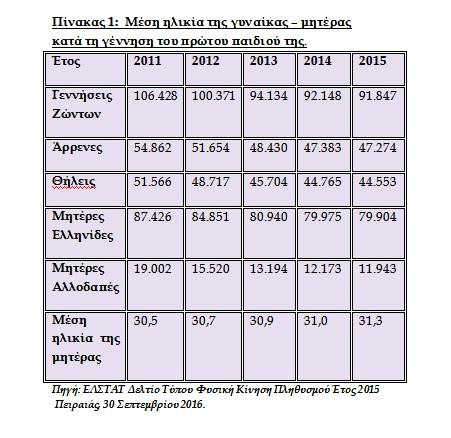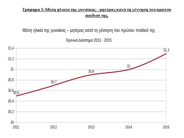Η μέση ηλικία της μητέρας κατά τη γέννηση του πρώτου παιδιού της το 2015 ήταν 31,3 έτη σημειώνοντας αύξηση σε σχέση με το 2014 που η αντίστοιχη μέση ηλικία ήταν 31,0 έτη. Πηγή: ΕΛΣΤΑΤ Δελτίο Τύπου Φυσική Κίνηση Πληθυσμού Έτος 2015 Πειραιάς, 30 Σεπτεμβρίου 2016.