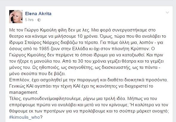 Τις πληροφορίες που μετέδωσε η «Καθημερινή» και αναφέρουν πως ο Γιώργος Κιμούλης θα είναι ο νέος διευθύνων σύμβουλος στο Κέντρο Πολιτισμού Ιδρυμα Σταύρος Νιάρχος, πληροφορίες για τις οποίες ο γνωστός ηθοποιός δεν έχει τοποθετηθεί, σχολίασε στο Facebook, η δημοσιογράφος Έλενα Ακρίτα.