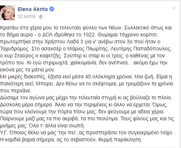 Δύσκολες ώρες για τους εργαζόμενους του Δημοσιογραφικού Οργανισμού Λαμπράκη μετά τις τελευταίες εξελίξεις. Ανάμεσα τους και η δημοσιογράφος, Έλενα Ακρίτα, που μετράει δεκαετίες στο ΔΟΛ και γράφει στον προσωπικό της λογαριασμό στο Facebook: