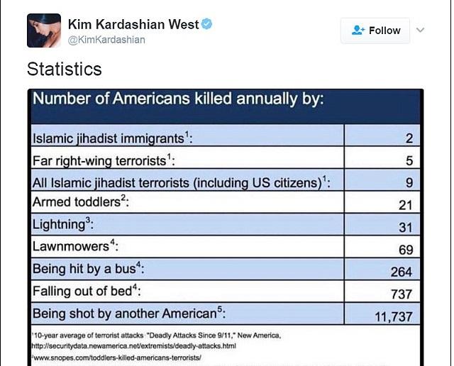 Οι επίσημες στατιστικές που δημοσίευσε η ριάλιτι σταρ αποδεικνύουν ότι κατά μέσο όρο, τα τελευταία 10 χρόνια, δύο Αμερικανοί δολοφονούνται από τζιχαντιστές κατ’ έτος, ενώ 11.000 Αμερικανοί πέφτουν νεκροί από τις σφαίρες επίσης Αμερικανών, κατόχων όπλων! Όπως ειρωνικά αποδεικνύεται από τον πίνακα, είναι πιο πιθανό να σκοτωθεί ένας Αμερικανός πολίτης πέφτοντας από το κρεβάτι του, παρά από σφαίρες ισλαμιστών…