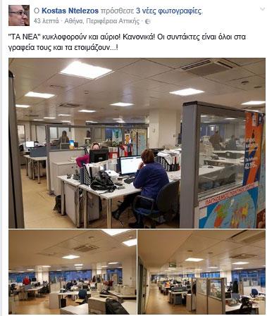 Ο Κώστας Ντελέζος «ανέβασε» φωτογραφίες από τα γραφεία της εφημερίδας στη Μιχαλακοπούλου, και έγραψε: «Τα “Νέα” κυκλοφορούν και αύριο! Κανονικά! Οι συντάκτες είναι όλοι στα γραφεία τους και τα ετοιμάζουν…!».