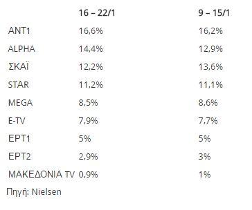 Ο ΣΚΑΪ, αντιθέτως, είχε μικρή πτώση και βρέθηκε στην τρίτη θέση.