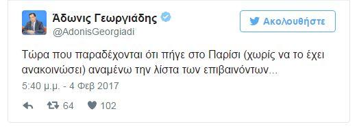 «Τώρα που παραδέχονται ότι πήγε στο Παρίσι (χωρίς να το έχει ανακοινώσει) αναμένω τη λίστα των επιβαινόντων…», αναφέρει μέσω Twitter ο αντιπρόεδρος της Νέας Δημοκρατίας.