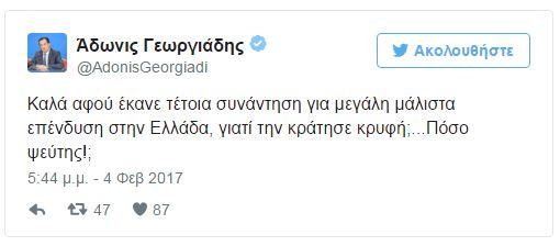Και επανέρχεται με δεύτερο tweet στο οποίο σημειώνει: «Καλά αφού έκανε τέτοια συνάντηση για μεγάλη μάλιστα επένδυση στην Ελλάδα, γιατί την κράτησε κρυφή;…Πόσο ψεύτης!;»