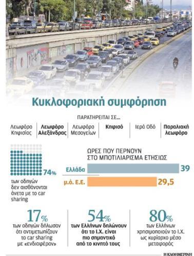 Ενδεικτικό της νοοτροπίας των οδηγών είναι ότι παρά τις οικονομικές δυσκολίες το car sharing, που θα μπορούσε να αποτελέσει λύση στο έντονο κυκλοφοριακό της πόλης, δεν φαίνεται να είναι στις προτιμήσεις τους. Η πλειονότητα των οδηγών (74%) δήλωσε (σε έρευνα της Lease Plan Hellas που πραγματοποιήθηκε σε συνεργασία με την TNS ICAP) ότι δεν αισθάνεται άνετα με την προοπτική τού να μοιράζεται το αυτοκίνητό του με αγνώστους ακόμη και εάν αυτό οδηγούσε σε σημαντική εξοικονόμηση χρημάτων. Μόλις το 17% των ερωτηθέντων δήλωσε ότι το αντιμετωπίζει ως μια «ενδιαφέρουσα» προοπτική.