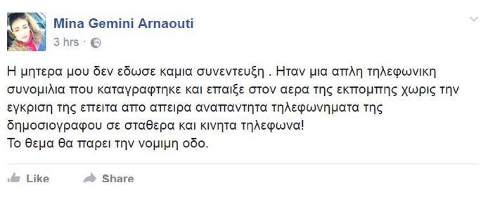 «Η μητέρα μου δεν έδωσε καμιά συνέντευξη. Ήταν μια απλή τηλεφωνική συνομιλία που καταγράφτηκε και έπαιξε στον αέρα της εκπομπής χωρίς την έγκριση της έπειτα από άπειρα αναπάντητα τηλεφωνήματα της δημοσιογράφου σε σταθερά και κινητά τηλεφωνά! Το θέμα θα πάρει την νόμιμη οδό», υποστήριξε στην ανάρτησή της στο Facebook.