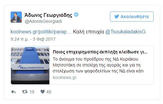Ο αντιπρόεδρος της ΝΔ, Άδωνις Γεωργιάδης, επιβεβαίωσε εμμέσως τα δημοσιεύματα ευχόμενος μέσω Twitter στον επιχειρηματία που λάνσαρε το περίφημο πόσιμο κολλαγόνο στην Ελλάδα «καλή επιτυχία».