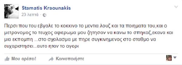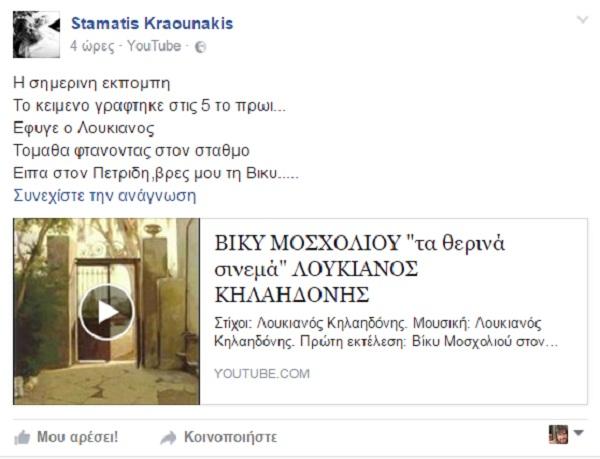 Σε ανάρτηση του ο Σταμάτης Κραουνάκης περιγράφει την τελευταία συνομιλία του με τον Λουκιανό, ύστερα από ένα αφιέρωμα στο οποίο ο Κραουνάκης έκανε το σπικάζ: «Περσι που του εβγαλε το κοκκινο το μεντια λουζ και τα ποιηματα του,και ο μετρονομος το τευχος αφιερωμα μου ζητησαν να κανω το σπηκαζ,εκανα και μια εκπομπη …στο σχολασμα με πηρε συγκινημενος στο σταθμο να ευχαριστησει…αυτο ηταν το αγορι»