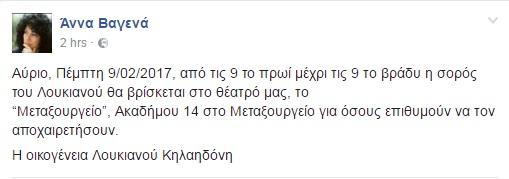 «Αύριο, Πέμπτη 9/02/2017, από τις 9 το πρωί μέχρι τις 9 το βράδυ η σορός του Λουκιανού θα βρίσκεται στο θέατρό μας, το “Μεταξουργείο”, Ακαδήμου 14 στο Μεταξουργείο για όσους επιθυμούν να τον αποχαιρετήσουν.