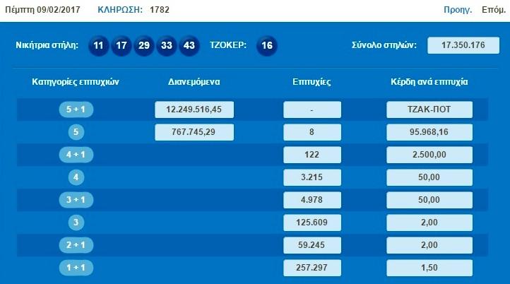 Οι τυχεροί αριθμοί του Τζόκερ στην κλήρωση της Πέμπτης και τα κέρδη ανά κατηγορία είναι: