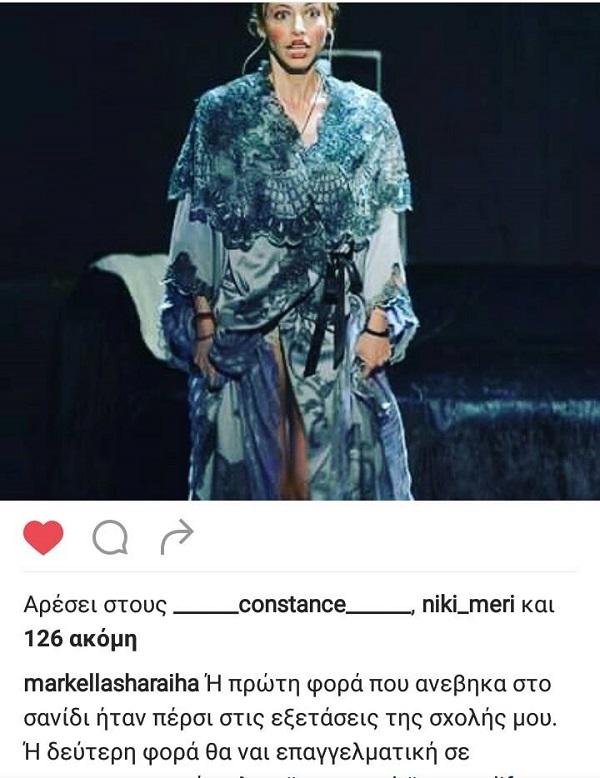 Η Μαρκέλλα Σαράιχα, εκτός από την στήλη με συνεντεύξεις επωνύμων που διατηρεί στο aixmi.gr, θα πρωταγωνιστήσει σε παράσταση που θα ανεβεί στο θέατρο Τσάι στη Σαχάρα λίγο μετά το Πάσχα. Η ίδια ενημέρωσε τους διαδικτυακούς της φίλους μέσα από τον λογαριασμό της στο Instagram, γράφοντας το εξής: «Η πρώτη φορά που ανέβηκα στο θεατρικό σανίδι ήταν πέρσι στις εξετάσεις της σχολής μου. Η δεύτερη φορά θα ναι επαγγελματική σε πρωταγωνιστικό ρόλο…».
