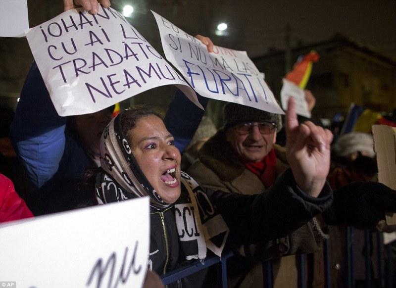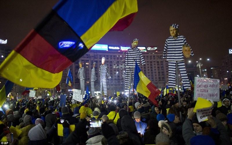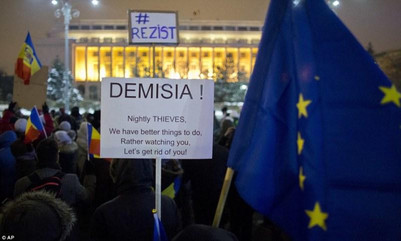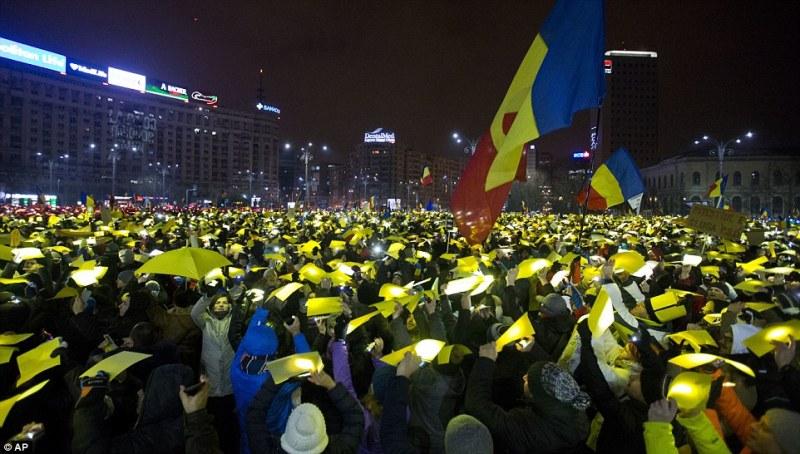 «Κλέφτες, παραιτηθείτε!», φώναζαν οι διαδηλωτές που συγκεντρώθηκαν μπροστά στην έδρα της κυβέρνησης χθες βράδυ. Και με το φως απ’ τα κινητά τους τηλέφωνα και χρωματιστά χαρτιά πρόβαλλαν τα χρώματα της σημαίας της Ρουμανίας, μπλε, κίτρινο και κόκκινο.