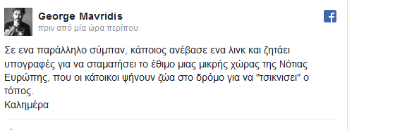 «Σε ένα παράλληλο σύμπαν, κάποιος ανέβασε ένα λινκ και ζητάει υπογραφές για να σταματήσει το έθιμο μιας μικρής χώρας της Νότιας Ευρώπης, που οι κάτοικοι ψήνουν ζώα στο δρόμο για να “τσικνισει” ο τόπος. Καλημέρα».