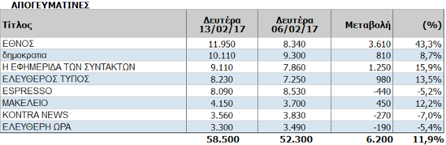 ΕΘΝΟΣ συν 41% στις 9/2, συν 31% στις 10/2, συν 54% το Σάββατο. Αυξημένα ποσοστά – αν και μικρότερα από αυτά του ΕΘΝΟΥΣ- στις πωλήσεις τους σημείωσαν και η Εφημερίδα των Συντακτών και η Δημοκρατία.