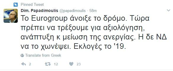 «Το Eurogroup άνοιξε το δρόμο. Τώρα πρέπει να τρέξουμε για αξιολόγηση, ανάπτυξη και μείωση της ανεργίας. Η δε ΝΔ να το χωνέψει. Εκλογές το 2019».