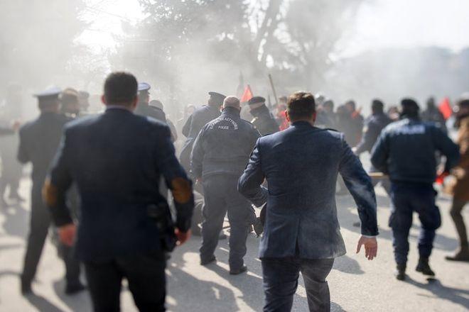 Όπως φαίνεται στις φωτογραφίες, άνδρας της ασφάλειας διακρίνεται να έχει στα χέρια τη σημαία του διαδηλωτή που προσήχθη και την ώρα της προσαγωγής, εν μέσω γενικευμένων επεισοδίων και να τον χτυπά με το κοντάρι στο κεφάλι.