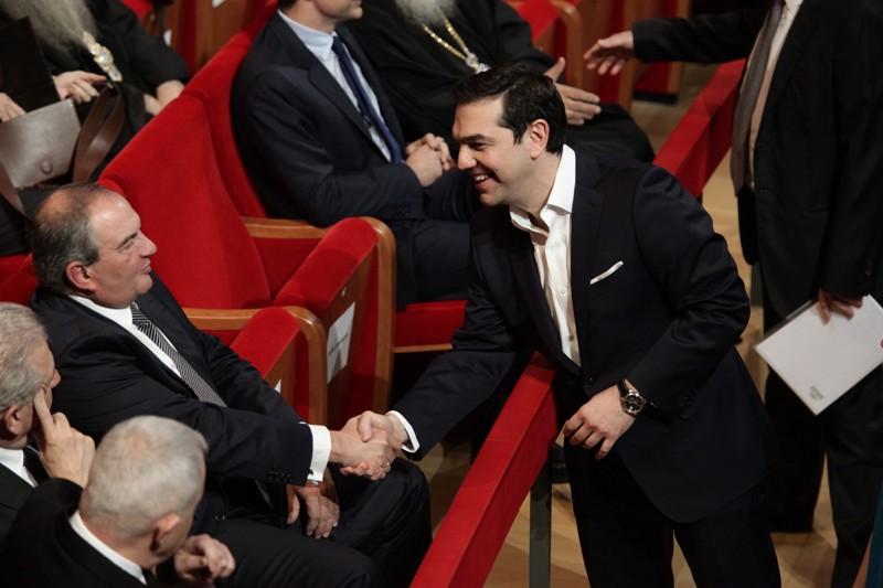 Θερμή ήταν και η χειραψία του κ. Τσίπρα με τον πρώην πρωθυπουργό Κώστα Καραμανλή, ο οποίος, με τη σειρά του, ήταν ευδιάθετος, όπως φαίνεται και από τα γέλια που μοιράζεται με τον Έλληνα επίτροπο Δημήτρη Αβραμόπουλο.