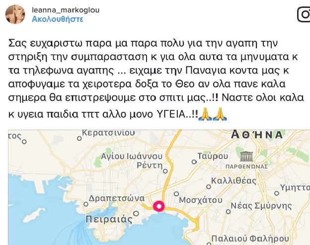 Η Λεάνα Μάρκογλου έγραψε χαρακτηριστικά: “Σας ευχαριστώ πάρα πολύ για την αγάπη, τη στήριξη και τη συμπαράσταση και για όλα αυτά τα μηνύματα και τηλέφωνα αγάπης… Είχαμε την Παναγιά κοντά μας και αποφύγαμε τα χειρότερα δόξα τω Θεώ, αν όλα πάνε καλά σήμερα θα επιστρέψουμε στο σπίτι μας. Να είστε όλοι καλά και υγεία παιδιά… μόνο υγεία!”.