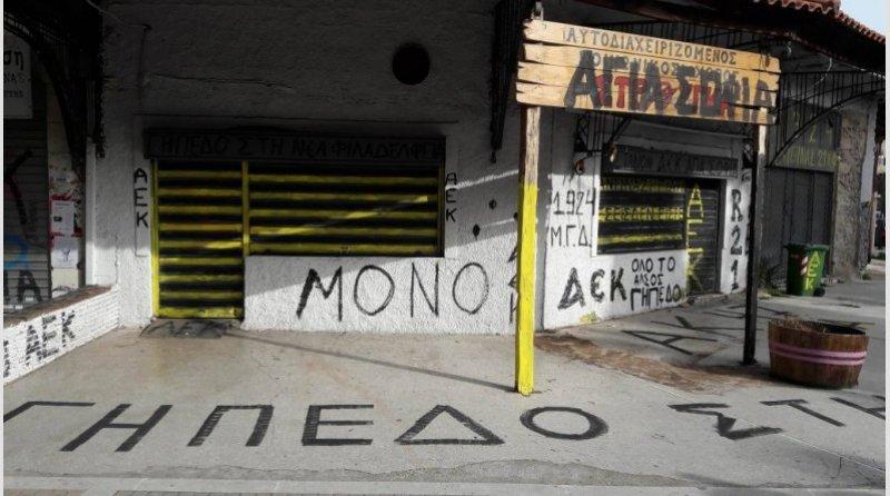 «Γήπεδο στη Νέα Φιλαδέλφεια» και «Βασιλόπουλε φασίστα» είναι κάποια από αυτά που έγραψαν οι οπαδοί της ΑΕΚ.