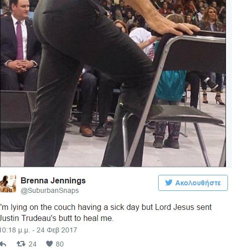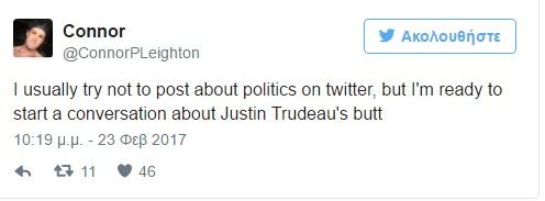 Μία κυρία σχολιάζει: «Είμαι άρρωστη σήμερα και ο καλός Θεός μου έστειλε τα οπίσθια του Τριντό για να θεραπευτώ». Άλλη κυρία, λέει: «Συνήθως δεν ποστάρω πολιτικά στο τουίτερ, αλλά είμαι έτοιμη να ξεκινήσω μία συζήτηση για τα οπίσθια του Τριντό».