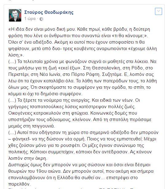 «Η ιδέα δεν είναι μόνο δική μου. Κάθε πρωί, κάθε βράδυ, η δεύτερη φράση που λένε οι άνθρωποι που συναντώ είναι «τι θα κάνουμε;».Όλοι σ’ ένα αδιέξοδο. Ακόμη κι αυτοί που έχουν αποφασίσει τι θα ψηφίσουν, μετά από δυο- τρεις κουβέντες αναρωτιούνται «έχουμε άλλη λύση;».(…) Τα τελευταία χρόνια με φωνάζουν συχνά οι μαθητές στα λύκεια. Να τους μιλήσω για τη ζωή «εκεί έξω». Στη Θεσσαλονίκη, στη Ρόδο, στο Περιστέρι, στη Νέα Ιωνία, στο Πόρτο Ράφτη. Συζητάμε. Ε, λοιπόν σας λέω ότι τα έχουν καταλάβει όλα. Τα λάθη των πατεράδων τους, τα λάθη όλων μας. Ότι σκεφτόμαστε το συμφέρον για την ομάδα, το σπίτι, το κόμμα κι όχι το δημόσιο συμφέρον.(…) Τα ξέρετε τα νούμερα της ανεργίας. Και ειδικά των νέων. Οι γρήγορες τσαπατσούλικες λύσεις κατέστρεψαν πολλές ζωές. Οικογένειες κατρακυλούν στη φτώχεια. Κοινωνικές δομές που υποστήριζαν τους αδύναμους, κλείνουν. Από τη σπατάλη περάσαμε μεμιάς στη τσιγκουνιά.(…) Αυτοί που οδήγησαν τη χώρα στο σημερινό αδιέξοδο δεν μπορούν – φάνηκε!- να της δώσουν νέα ορμή. Ποιος να τους εμπιστευθεί; Μέχρι χθες ζούσαν μόνο για το ρουσφέτι. Οι μίζες έγιναν συνώνυμο της πολιτικής. Κάποιοι συμμετείχαν, κάποιοι δεν αντέδρασαν. Ας κάνουν λοιπόν στην άκρη.Δυστυχώς όμως δεν μπορούν να μας σώσουν και όσοι είναι δέσμιοι θεωριών του 19ου αιώνα. Δεν μπορούν αυτοί, που ακόμη και σήμερα επαναλαμβάνουν ότι η Ελλάδα θα σωθεί αν… επιστρέψει στο παρελθόν.Γι’ αυτό λοιπόν αποφασίσαμε να κάνουμε «ΤΟ ΠΟΤΑΜΙ». Ποιοι το αποφασίσαμε; Άνθρωποι με τα ίδια ερωτήματα.Φοιτητές, διανοούμενοι, οικονομολόγοι, εργάτες, καλλιτέχνες, άνεργοι, έμποροι, γιατροί, αρχιτέκτονες. Μια ομάδα που έχει μυαλό και δύναμη – τη δύναμη της λογικής και του δίκιου.(…) Δεν είναι εύκολο, το ξέρω, να αλλάξουμε συνήθειες. Αλλά δεν υπάρχει άλλος δρόμος για να αλλάξουμε ζωή.Καλημέρα λοιπόν και ελπίζω να συναντηθούμε. Τολμήστε το».