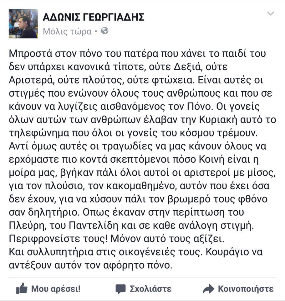 «Μπροστά στον πόνο του πατέρα που χάνει το παιδί του δεν υπάρχει κανονικά τίποτε, ούτε Δεξιά, ούτε Αριστερά, ούτε πλούτος, ούτε φτώχεια. Είναι αυτές οι στιγμές που ενώνουν όλους τους ανθρώπους και που σε κάνουν να λυγίζεις αισθανόμενος τον πόνο. Οι γονείς όλων αυτών των ανθρώπων έλαβαν την Κυριακή αυτό το τηλεφώνημα που όλοι οι γονείς του κόσμου τρέμουν» σημειώνει ο Αδωνις Γεωργιάδης.