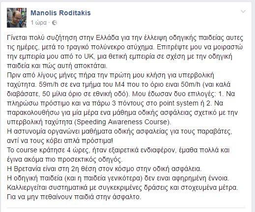 Ο Χανιώτης, Μανώλης Ροδιτάκης, που ζει και εργάζεται στην Αγγλία με αφορμή το τραγικό τροχαίο δυστύχημα στην Ε.Ο Αθηνών-Λαμίας, όπου χάθηκαν τέσσερις άνθρωποι εκ των οποίων ένα 3χρονο αγοράκι, έστειλε το δικό του μήνυμα  τονίζοντας τις διαφορές σε ότι αφορά στην οδηγική παιδεία σε Ελλάδα και Αγγλία και γιατί η Βρετανία είναι στη 2η θέση στον κόσμο όσον αφορά στην οδηγική ασφάλεια.
