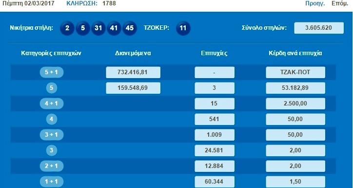 Τζακ ποτ σημειώθηκε στην κλήρωση του Τζόκερ. Οι τυχεροί αριθμοί και τα κέρδη ανά κατηγορία είναι:
