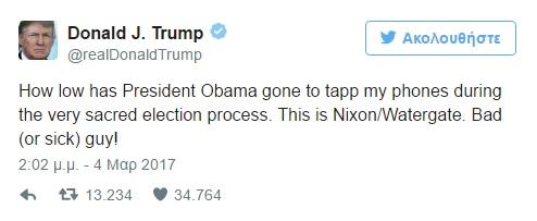 Ο πρόεδρος των ΗΠΑ έγραψε στο Twitter: «Τρομερό! Μόλις ανακάλυψα ότι ο Ομπάμα είχε βάλει «κοριούς» στον ουρανοξύστη Trump Tower λίγο πριν τη νίκη. Δεν βρήκε τίποτε. Αυτό είναι μακαρθισμός!».